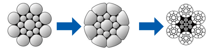 公司引进国外先进压实股工装技术,通过在线辊压,得到性能卓越的压实股钢丝绳